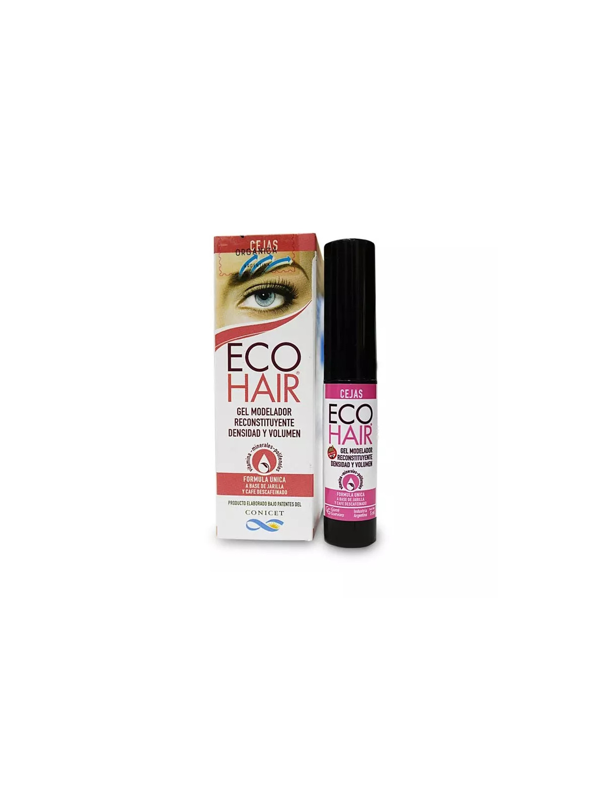 GEL MODELADOR RECONSTITUYENTE DE CEJAS ECOHAIR, producto cosmético desarrollado a partir de Extractos de Jarilla orgánica (Larrea divaricata) y Café descafeinado (Coffea arabica). El extracto de Jarilla tiene propiedades antioxidantes y antiinflamatorias, además de contener vitaminas y minerales y en conjunto al extracto de café, ayudan a estimular el fortalecimiento y engrosamiento de las cejas.